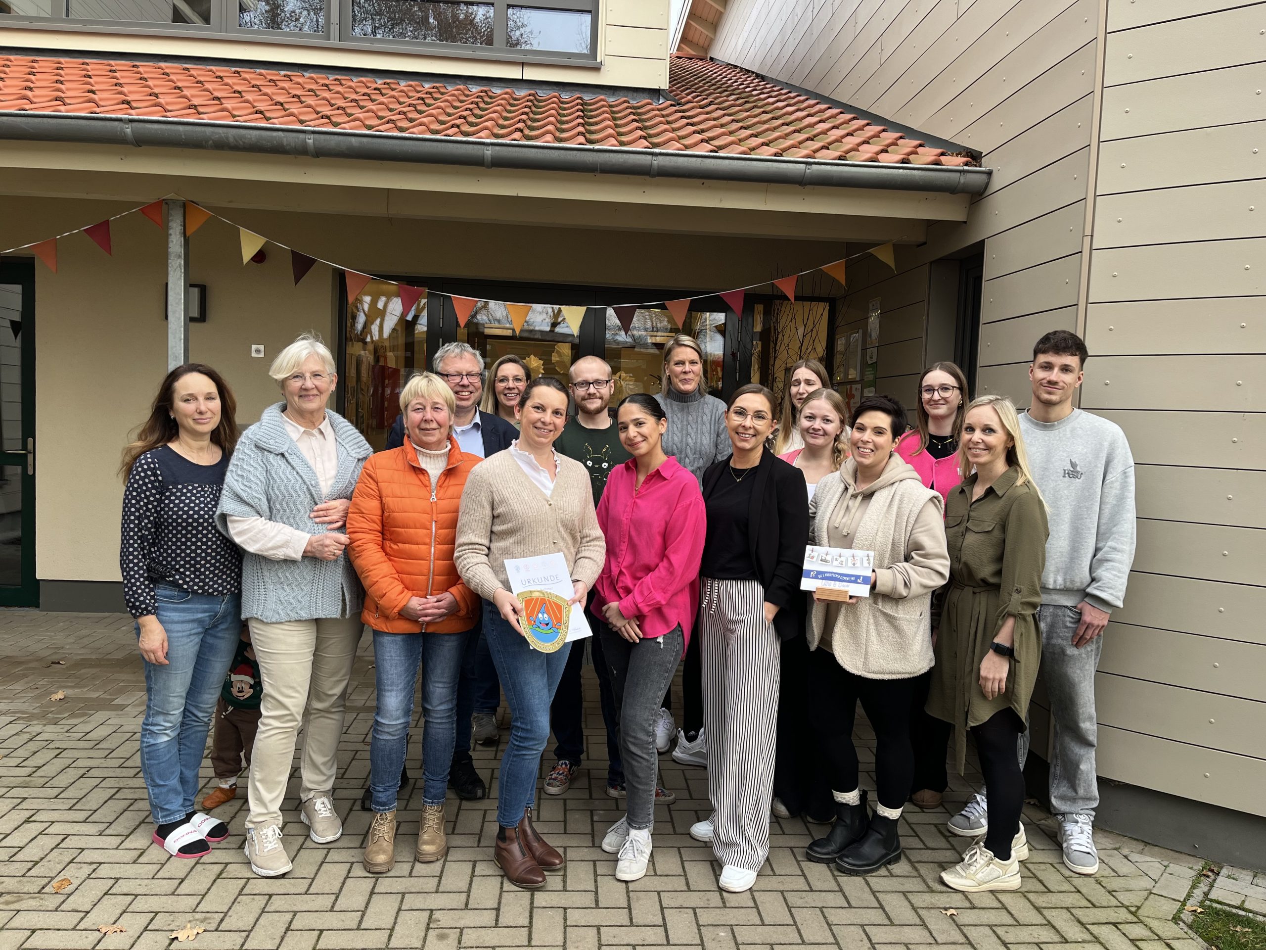Die Kita Bothmer darf sich jetzt „Zertifizierte Kneipp-Kita“ nennen. Mit viel Engagement und Begeisterung des Kita Personals und Unterstützung der Gemeinde Schwarmstedt ist der Kita Bothmer gelungen, was sonst keine Kita im Heidekreis von sich behaupten darf: die Kita ist eine zertifizierte Kneipp-Kita geworden. Insgesamt 12 Mitarbeiterinnen und Mitarbeiter der Kita nahmen erfolgreich an der Ausbildung Kneipp-Gesundheit für Kinder teil, die vom Kneipp-Bund in der Kita angeboten wurde. Damit ist das Personal der Kita in der Lage, den Kindern spielerisch das ganzheitliche Gesundheitskonzept nach Kneipp nahezubringen und ihnen so die Möglichkeit zu eröffnen, leicht gesundheitsbewusste Erwachsene von morgen zu werden. Ein erster positiver Erfolg zeigte sich bereits: die Kinder der Kita waren signifikant weniger von Erkältungserkrankungen betroffen als in den Vorjahren. In einer kleinen Feierstunde und in Anwesenheit der Schwarmstedter Bürgermeisterin Claudia Schiesgeries und des Samtgemeindebürgermeisters Björn Gehrs übergab Gisela Gehrmann vom Kneipp Bund Landesverband Niedersachsen das Zertifikat und die entsprechende Plakette. Beides wurde mit Freude entgegen genommen.